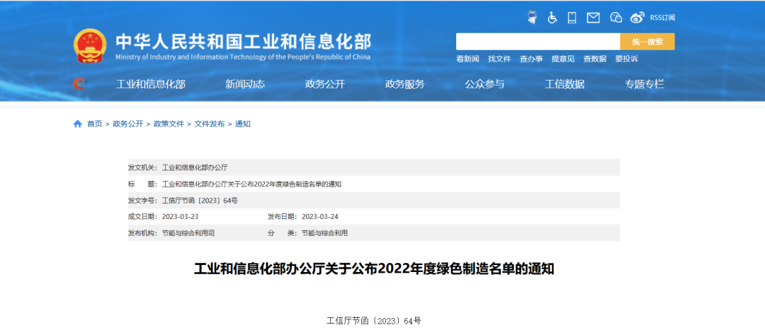 2023年3月23日,工业和信息化部公布2022年度绿色制造名单,包括绿色工厂874家、绿色设计产品643个、绿色工业园区47家、绿色供应链管理企业112家。按照2022年度动态管理要求,将前六批绿色制造名单中的41家绿色工厂、72个绿色设计产品、3家绿色工业园区、5家绿色供应链管理企业移出绿色制造名单,104家单位变更名称。同时要求各地工业和信息化主管部门加强对列入绿色制造名单的单位与相关产业政策的衔接、加强跟踪指导和动态管理等。