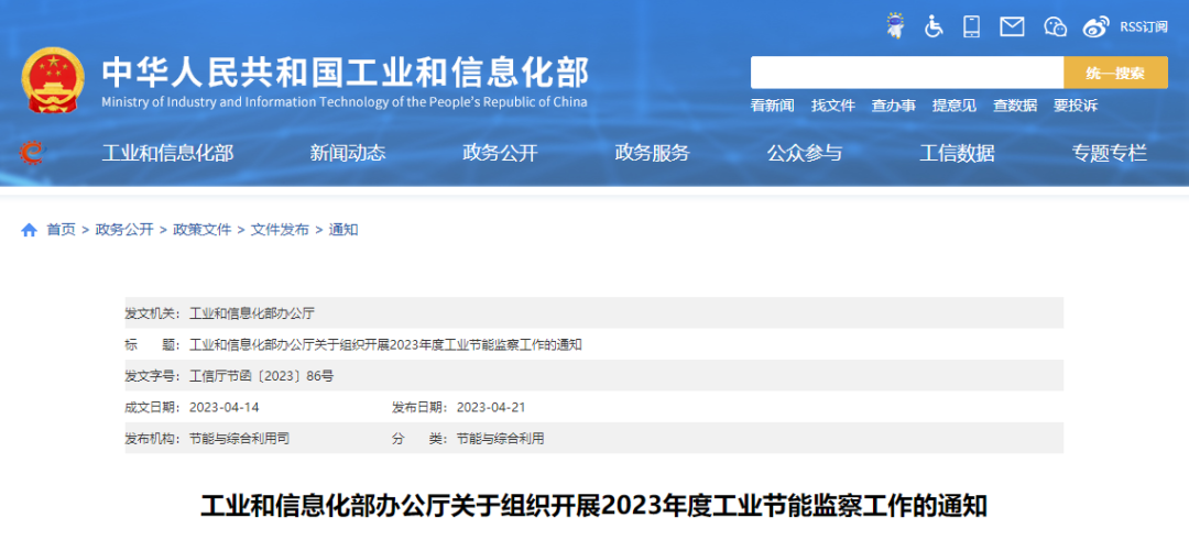 工业和信息化部办公厅关于组织开展2023年度工业节能监察工作的通知