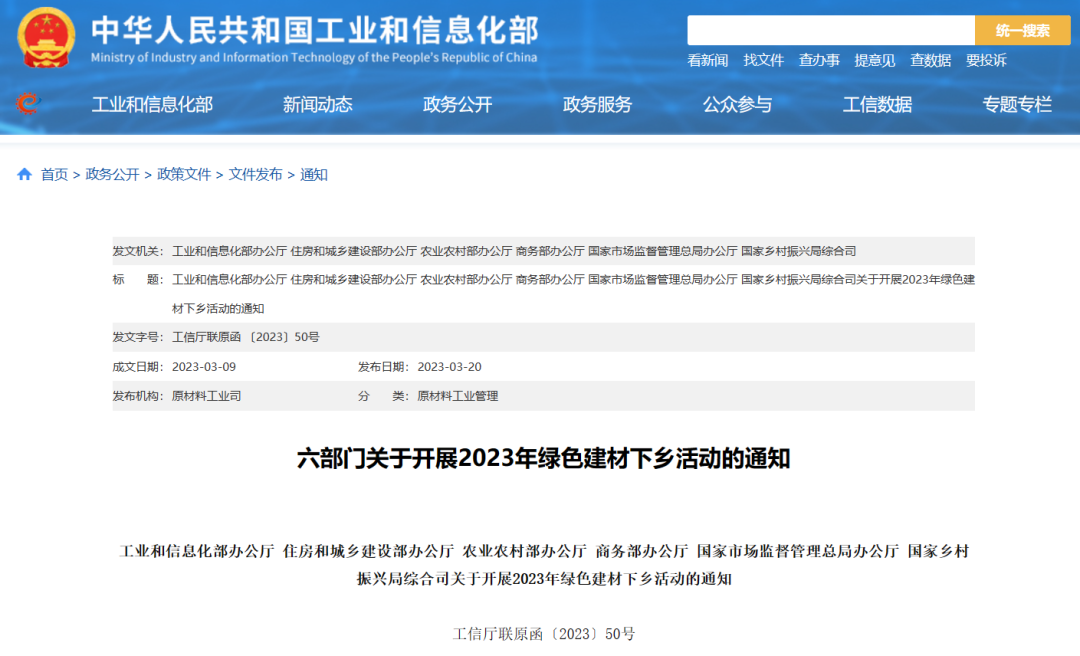为深入贯彻党的二十大关于建设现代化产业体系、全面推进乡村振兴的决策部署,加快绿色建材生产、认证和推广应用,促进绿色消费,助力美丽乡村建设,推动乡村产业振兴,工业和信息化部、住房和城乡建设部、农业农村部、商务部、国家市场监督管理总局、国家乡村振兴局决定在2022年试点工作基础上,进一步深入推进,联合开展2023年绿色建材下乡活动。有关事项通知如下: