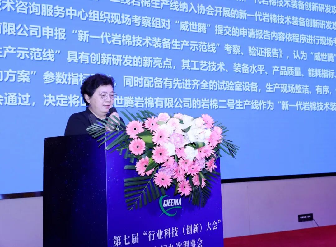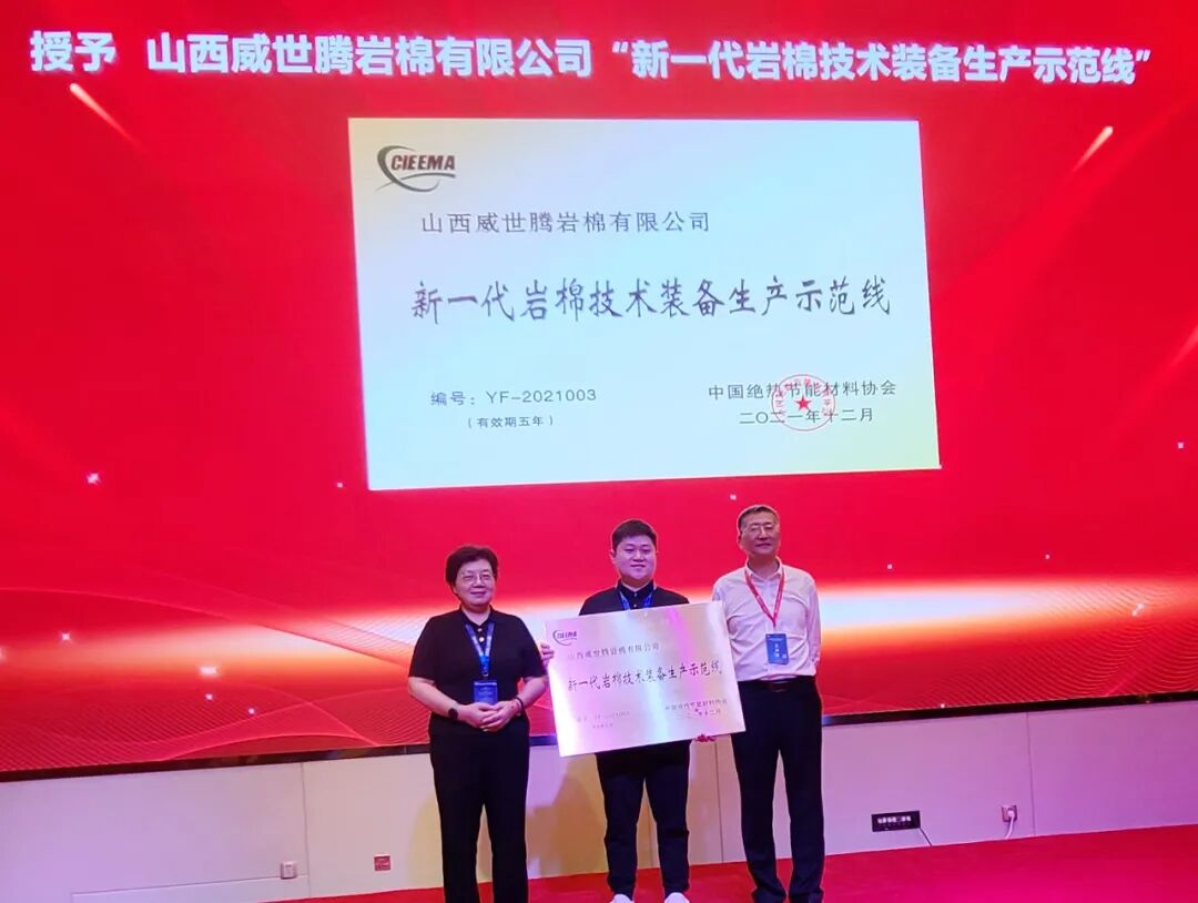协会总工程师汪丽婷宣读《关于山西威世腾岩棉有限公司的岩棉二号生产线作为“新一代岩棉技术装备生产示范线”的通知》。经理事会审议通过后,韩继先、汪丽婷为山西威世腾岩棉有限公司颁发“新一代岩棉技术装备创新研发生产示范线”铜牌,山西威世腾岩棉有限公司总经理杨豪上台领牌。