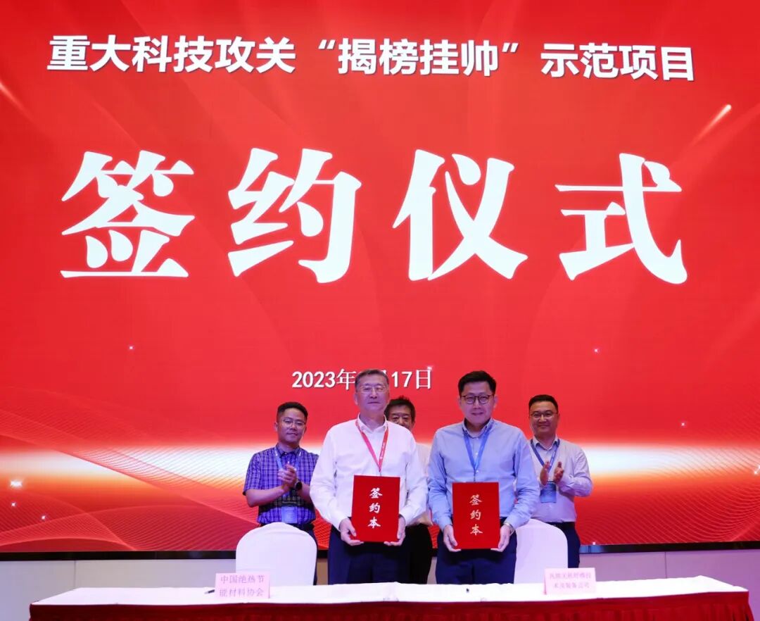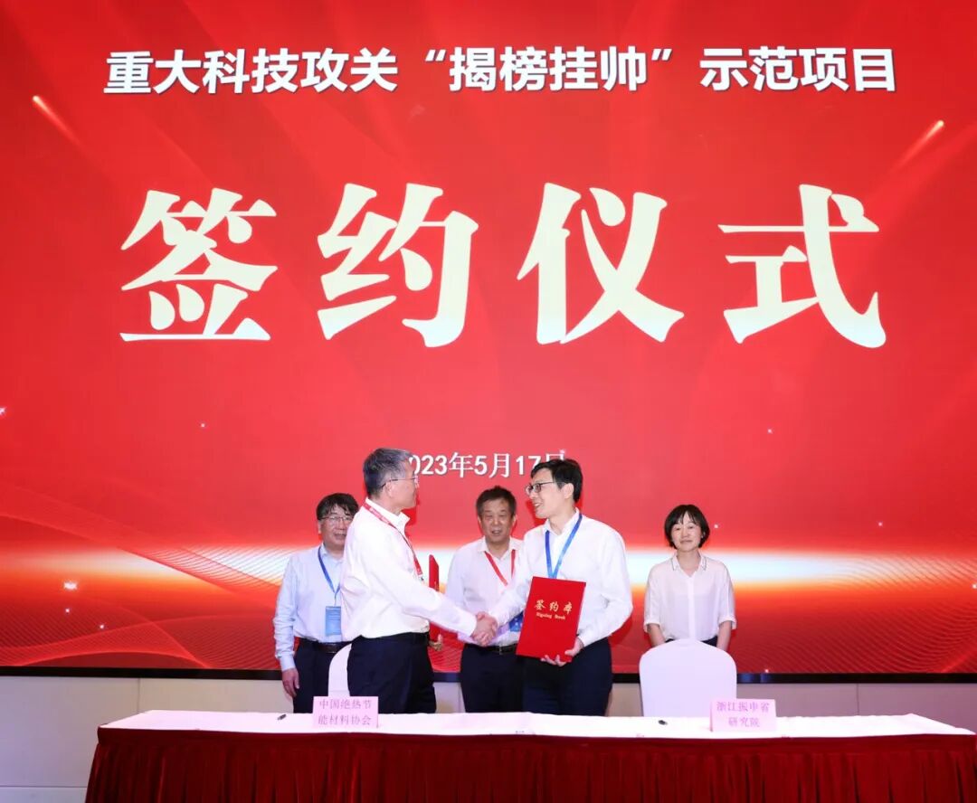 韩继先与“基于泡沫玻璃的高性能保温装饰一体板系统研究与应用示范”项目挂帅负责人花海东签约,孙诗兵、杜选东见证。韩继先与“无机纤维密度板材的研发及其工业化生产线开发”项目挂帅负责人仇晓星签约,杜选东、北新集团建材股份有限公司龙牌集团石膏板+定制事业部产品总监张同坤、南京玻璃纤维研究设计院有限公司工程公司总经理刘春见证。仇晓星代表重大科技攻关“揭榜挂帅”示范项目揭榜单位发言