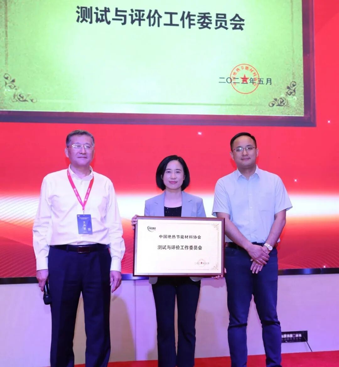 韩继先为“测试与评价工作委员会”授牌,中国国检测试控股集团股份有限公司总经理助理、南京国材检测有限公司董事长彭超,南京国材检测有限公司总经理师卓上台领牌。