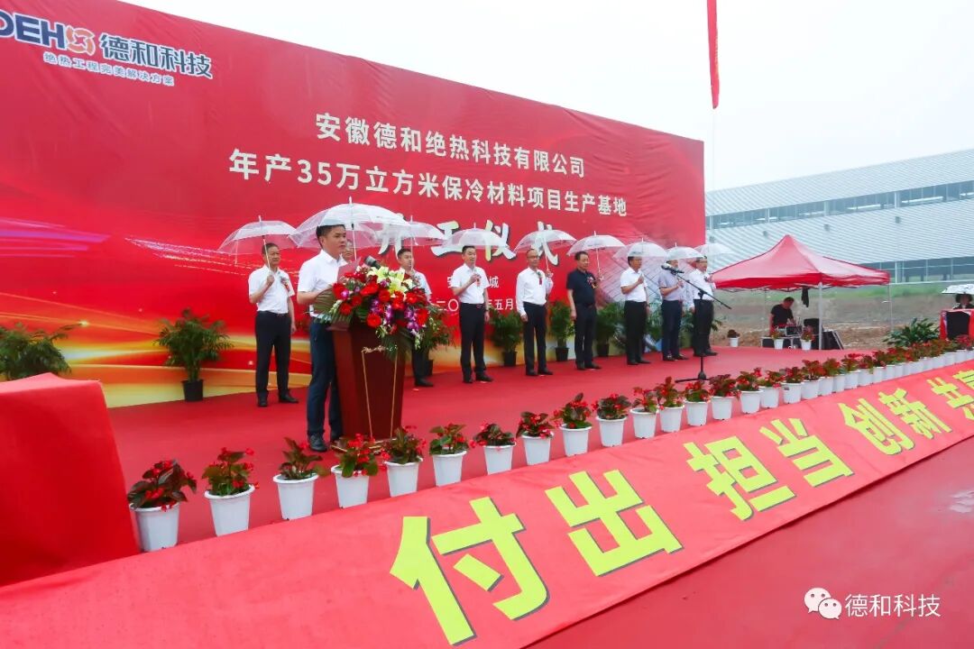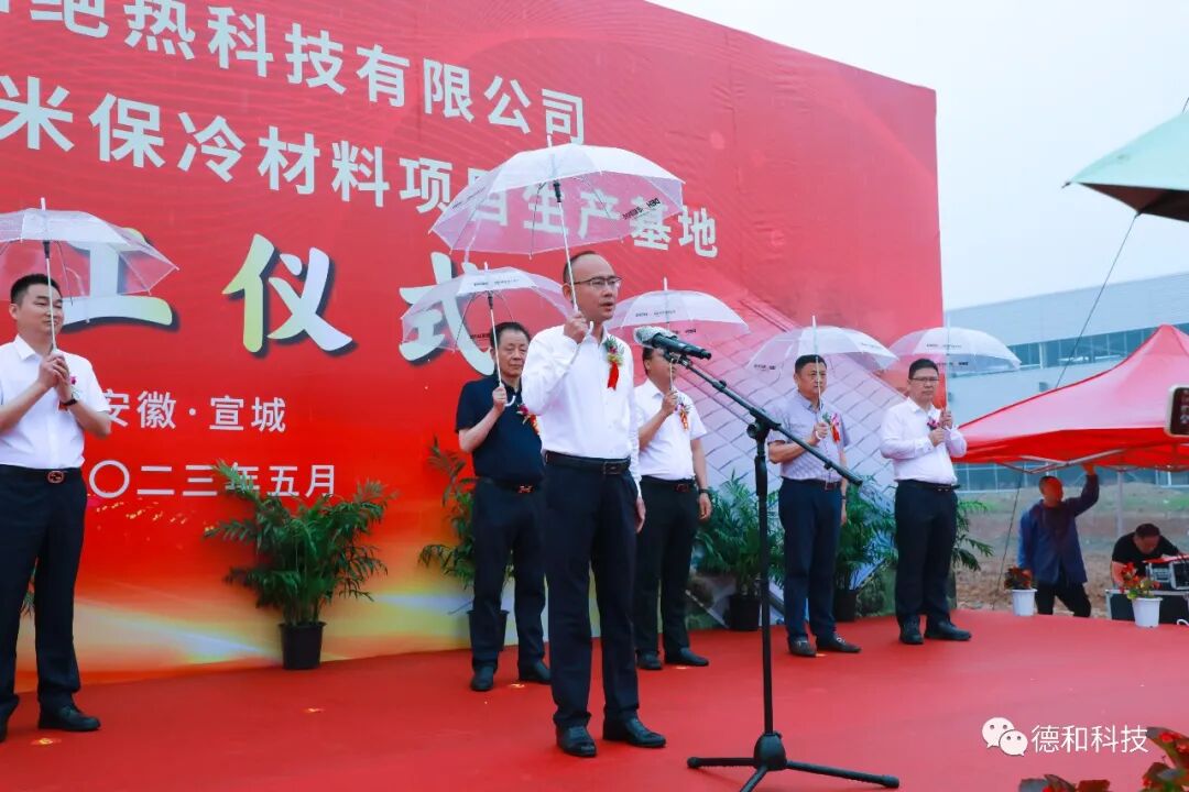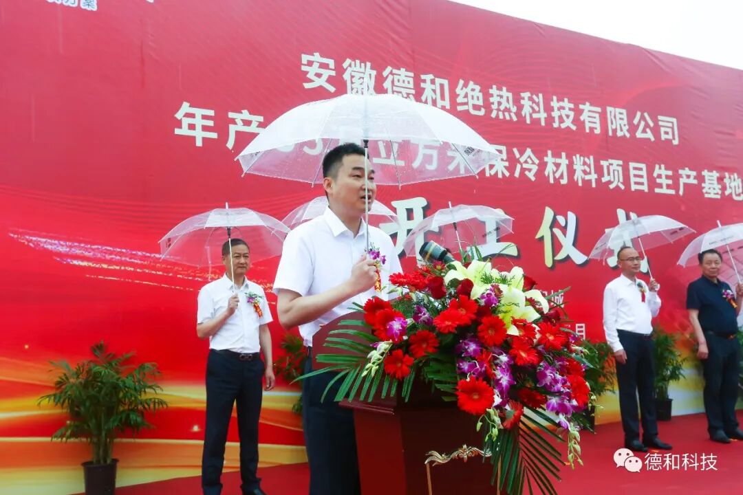 德和科技董事长管金国发言致辞:安徽基地建成投产后,可以实现两种材料的进口替代,这也是德和科技“深冷绝热工程系统材料国产替代计划”的重要推进项目,推动着中国绝热保冷技术朝着国产化替代迈进。”