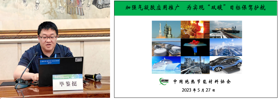中国绝热节能材料协会气凝胶材料分会副秘书长毕鉴挺受邀参加减污降碳论坛并做《加强气凝胶应用推广,为实现“双碳”目标保驾护航》的报告。报告从纳米气凝胶材料的诞生和产业发展开篇,介绍气凝胶复合材料在绝热方面的优异特性以及分享在电力、化工、冶金、窑炉、建筑、交通轻量化等方面的具体应用和产生的巨大节能减碳效果,用具体应用案例阐述了在当前加强推广气凝胶绝热节能材料应用的必要性和紧迫性。
