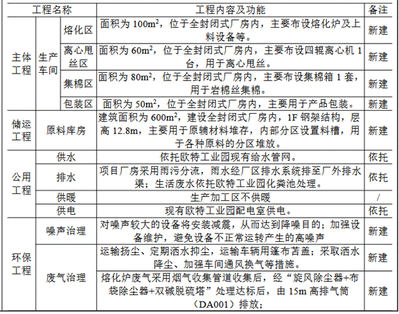 该项目主要建设内容为:建设岩棉生产线1条,用于岩棉丝生产。具体见下表。